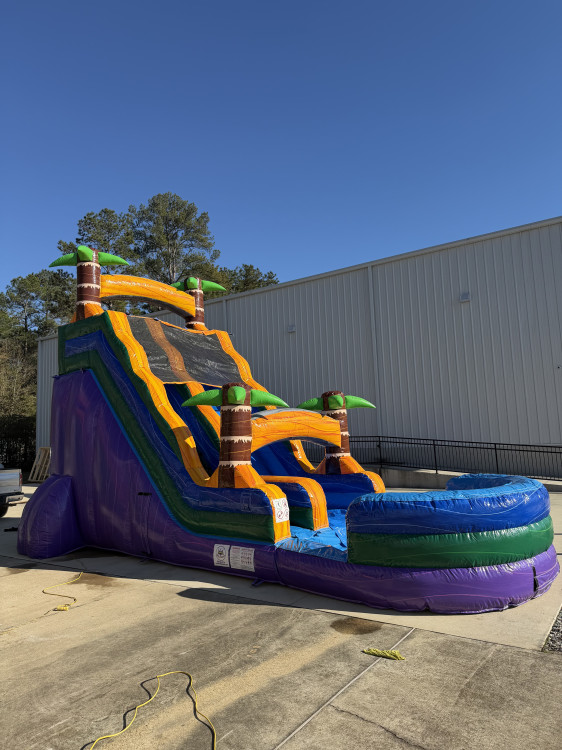 The bold colors and palm tree design make this waterslide especially popular for birthdays, school events, and neighborhood parties. It’s tall, exciting, and visually stunning — the kind of inflatable that guests remember long after the party is over.